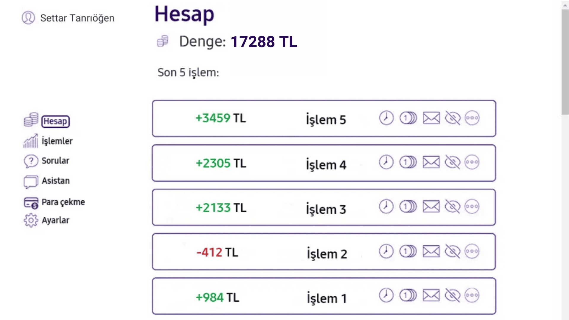 Sabahım, bakiyemi kontrol etmemle başladı, hesabımda şimdiden 17288 TL vardı! Şunu bir hayal edin. Bir gün içinde bakiyem iki katına çıktı. Kârımı zaten çekmek istiyordum, ancak bir hafta daha beklemeye karar verdim.